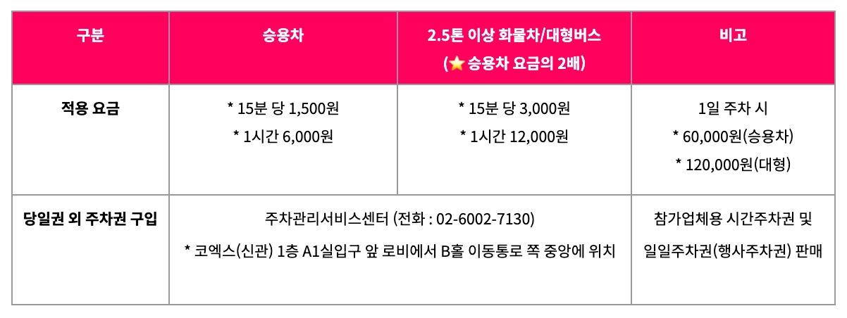 유효시간: 작업용 차량은 코엑스 진입 후 3시간 무료(1일 1회)