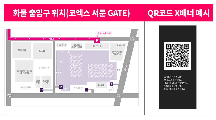 전시 Hall 진입구(세븐럭 카지노 건물 코엑스 서문 주차장 로딩독 방면)에 화물차량 할인 QR코드 출력물 부착(3시간 무료)