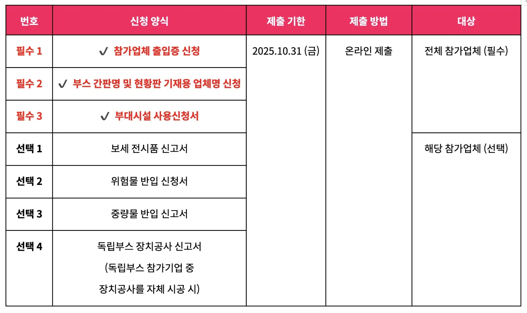 전시회 참가 신청 일자, 잔금 납부, 필수 서류 제출 기간, 공사 일정 등을 확인하여 원활한 전시회 운영이 될 수 있도록 준비해주세요!