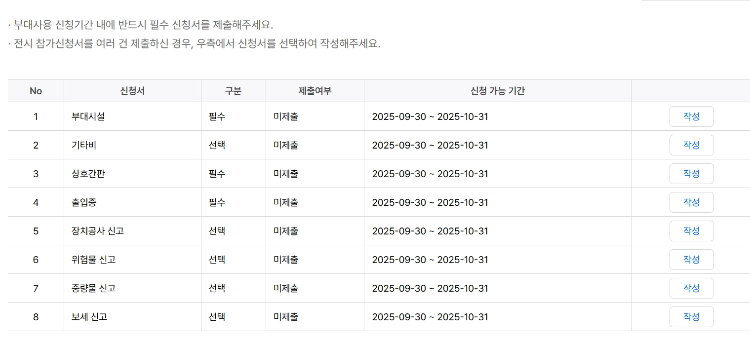 해당 페이지에서는 참가신청서 및 부대사용 신청 제출 방법을 확인할 수 있습니다.