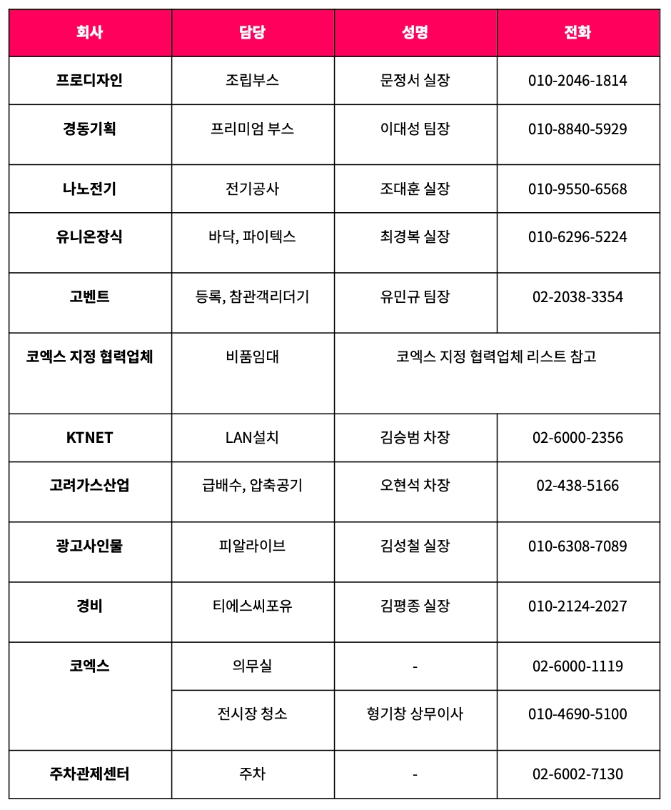 전시주최사무국 코엑스 전시 담당자의 연락처와 담당 업무 내용을 확인할 수 있어요